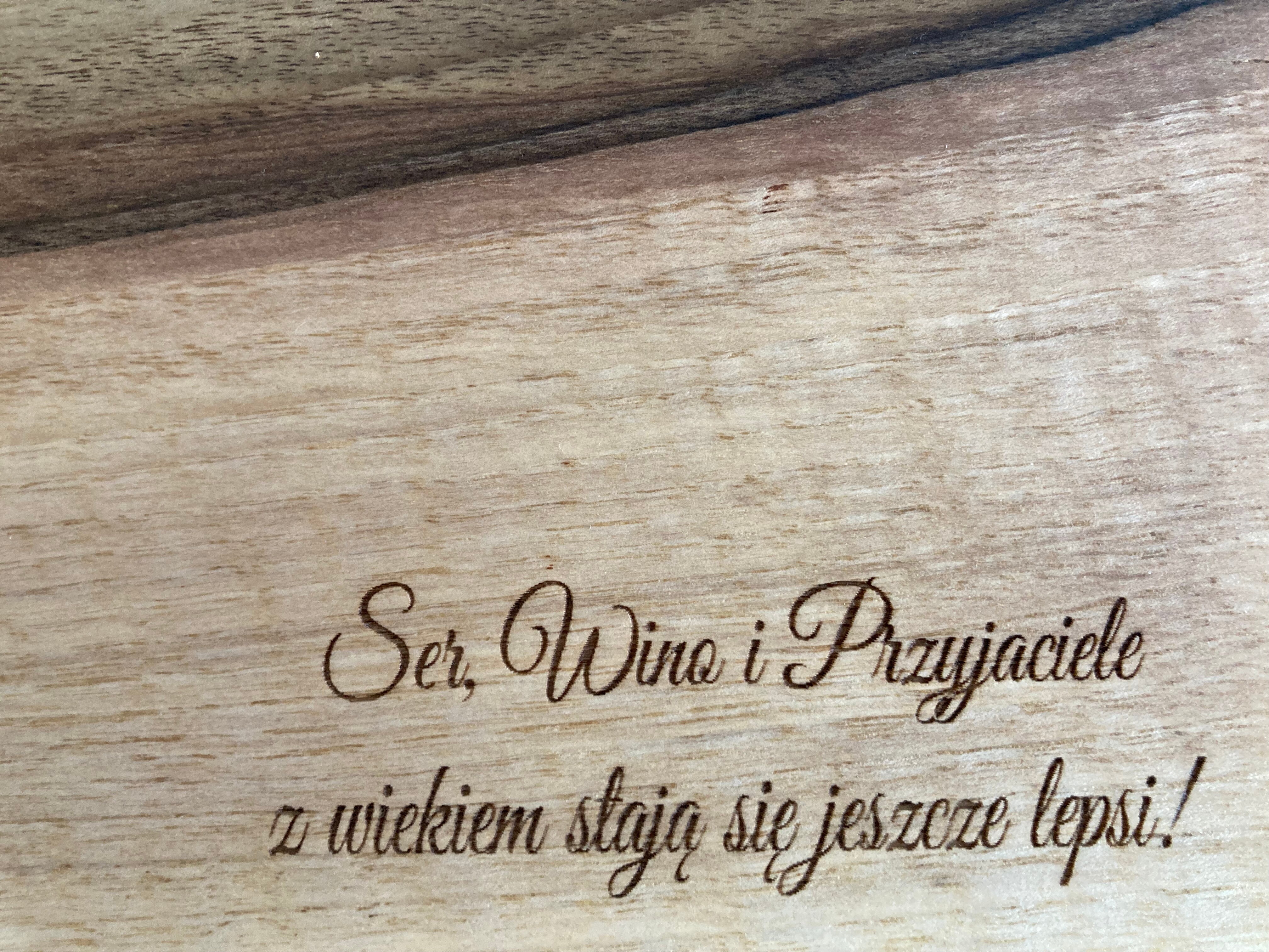 Na jej powierzchni znajduje się elegancki grawer:„Ser, Wino i Przyjaciele – z wiekiem stają się jeszcze lepsi.”To idealne motto, które tworzy ciepły, przyjazny klimat i sprawia, że deska świetnie sprawdzi się jako prezent.