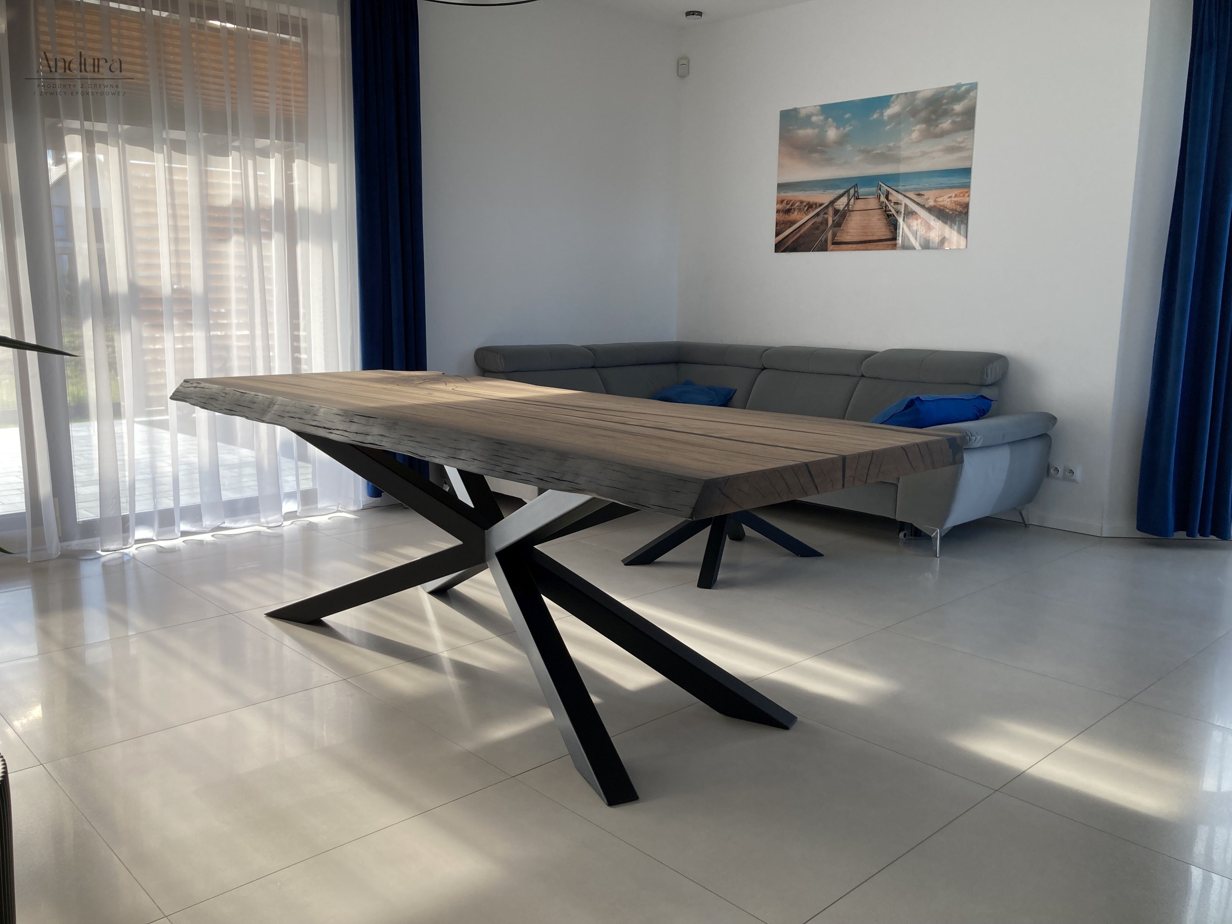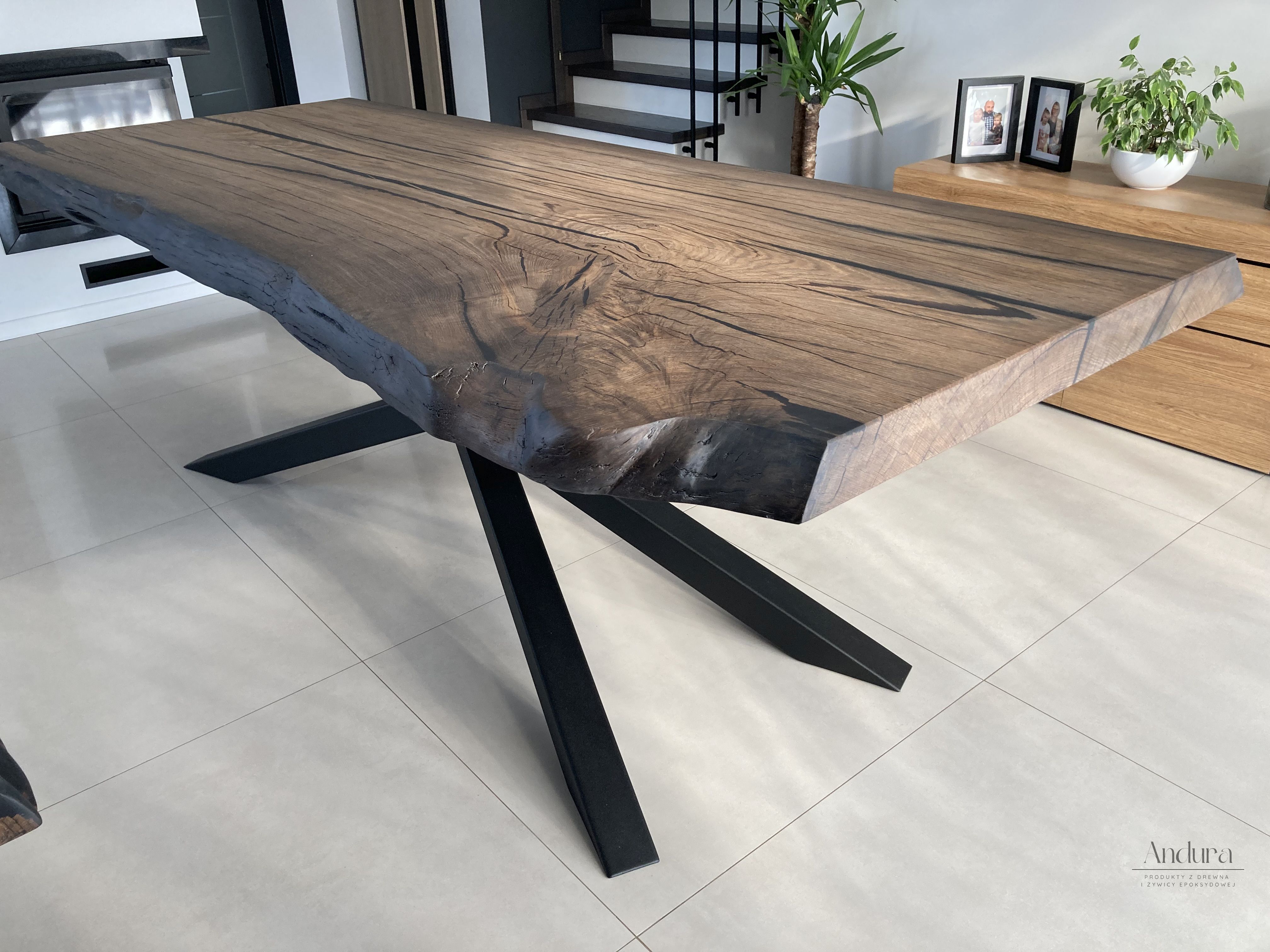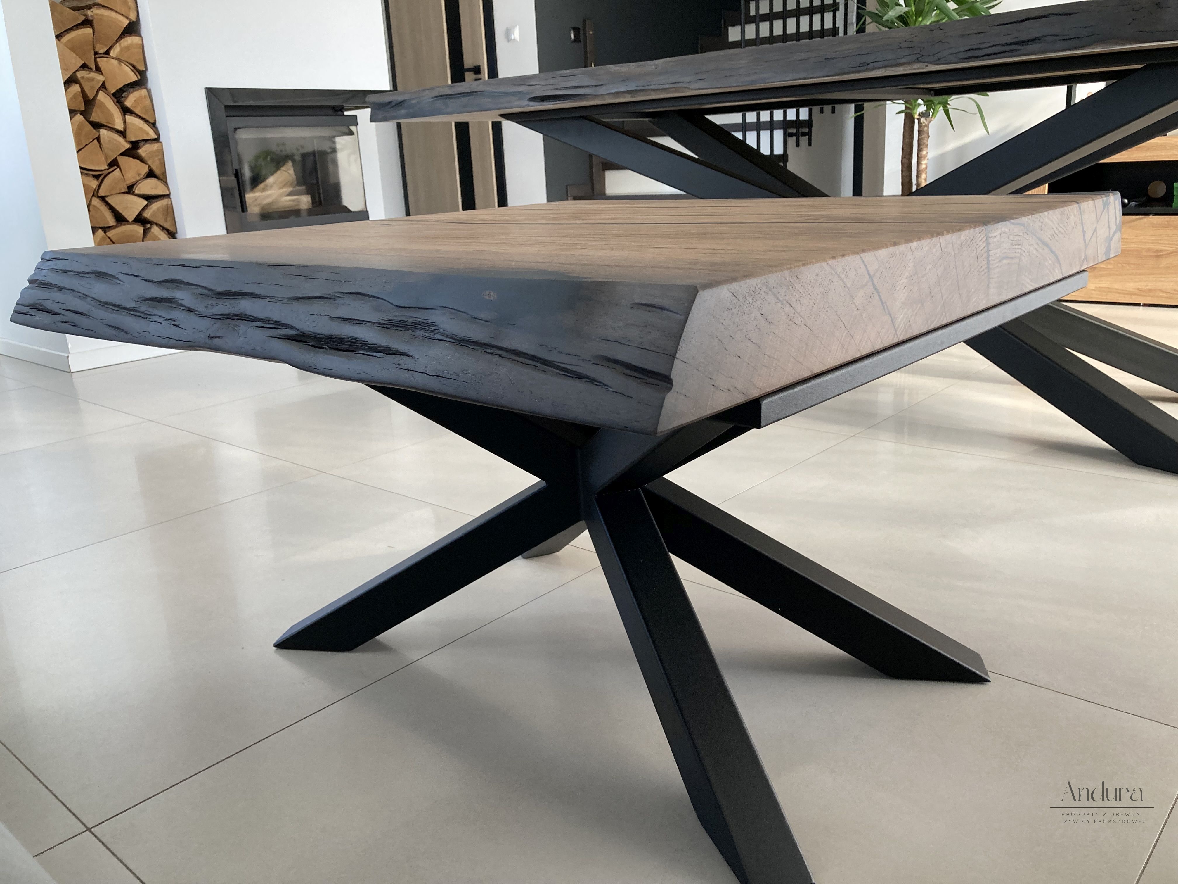 Blat o imponujących wymiarach 240 × 100 × 7,5 cm wykonany został z jednego kawałka litego czarnego dębu z zachowaną naturalną krawędzią, która podkreśla organiczny charakter drewna. Całość wsparta jest na solidnych stalowych nogach typu „pająk”, malowanych proszkowo na głęboki matowy czarny kolor. To połączenie surowości metalu i ponadczasowej elegancji drewna tworzy harmonijną kompozycję, idealną do przestronnych jadalni i reprezentacyjnych wnętrz.