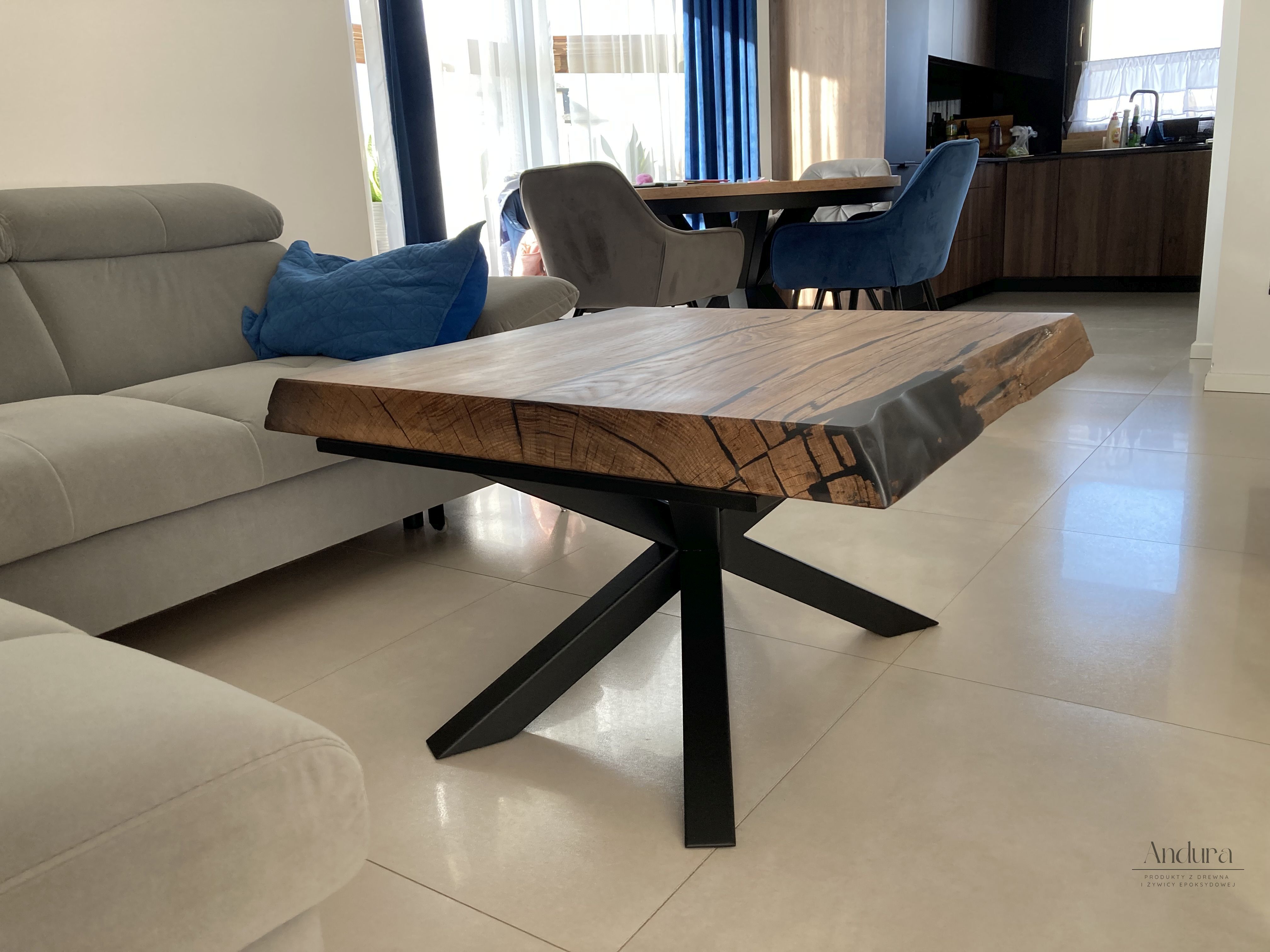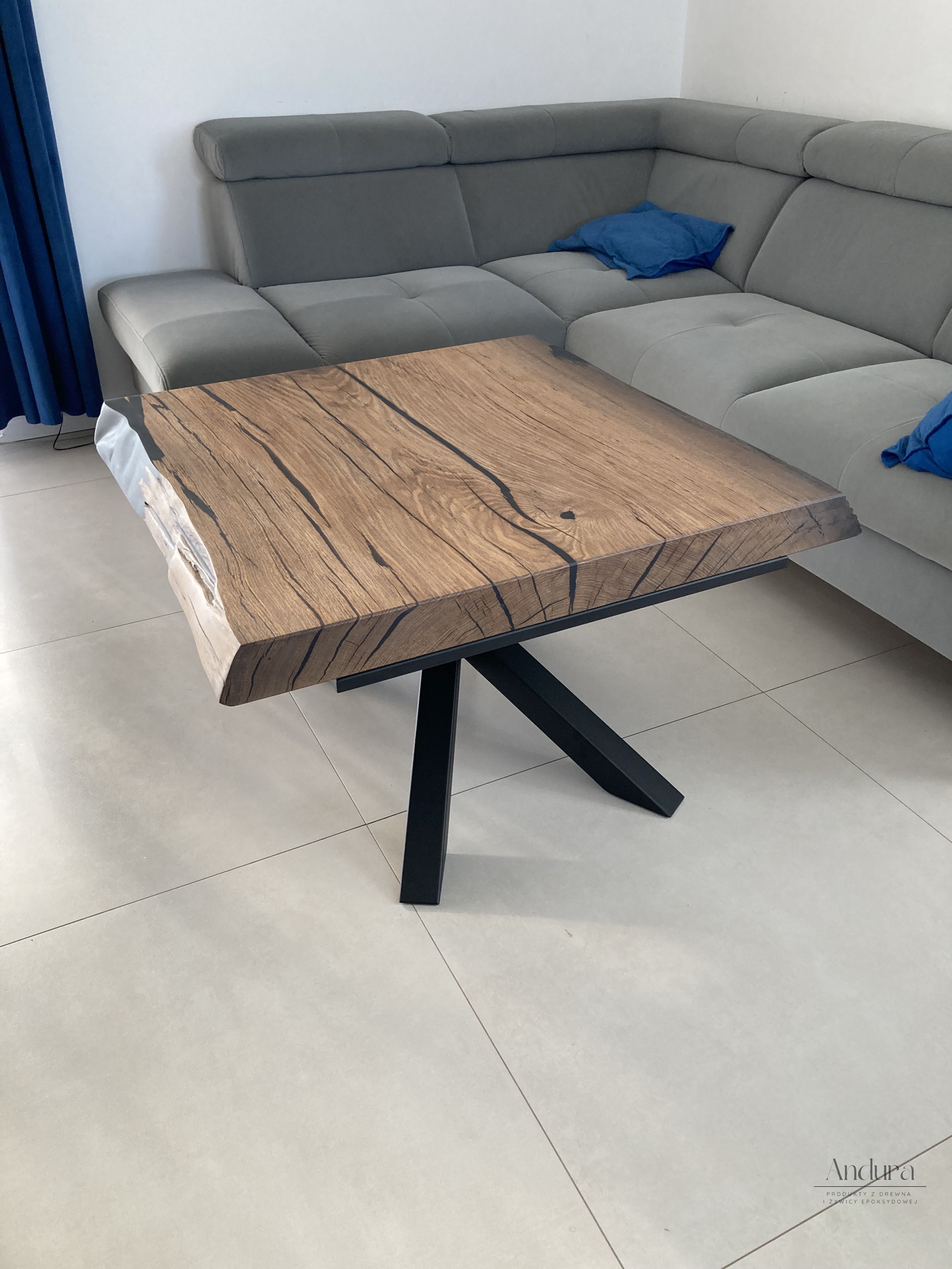 Mniejszy odpowiednik stołu zachowuje tę samą estetykę i precyzję wykonania. Blat o wymiarach 89 × 86 × 7,5 cm również posiada naturalną krawędź, a stalowe nogi typu „pająk” zapewniają stabilność i lekkość formy. Doskonale uzupełnia stół, tworząc spójną, elegancką całość w salonie lub przestrzeni wypoczynkowej.