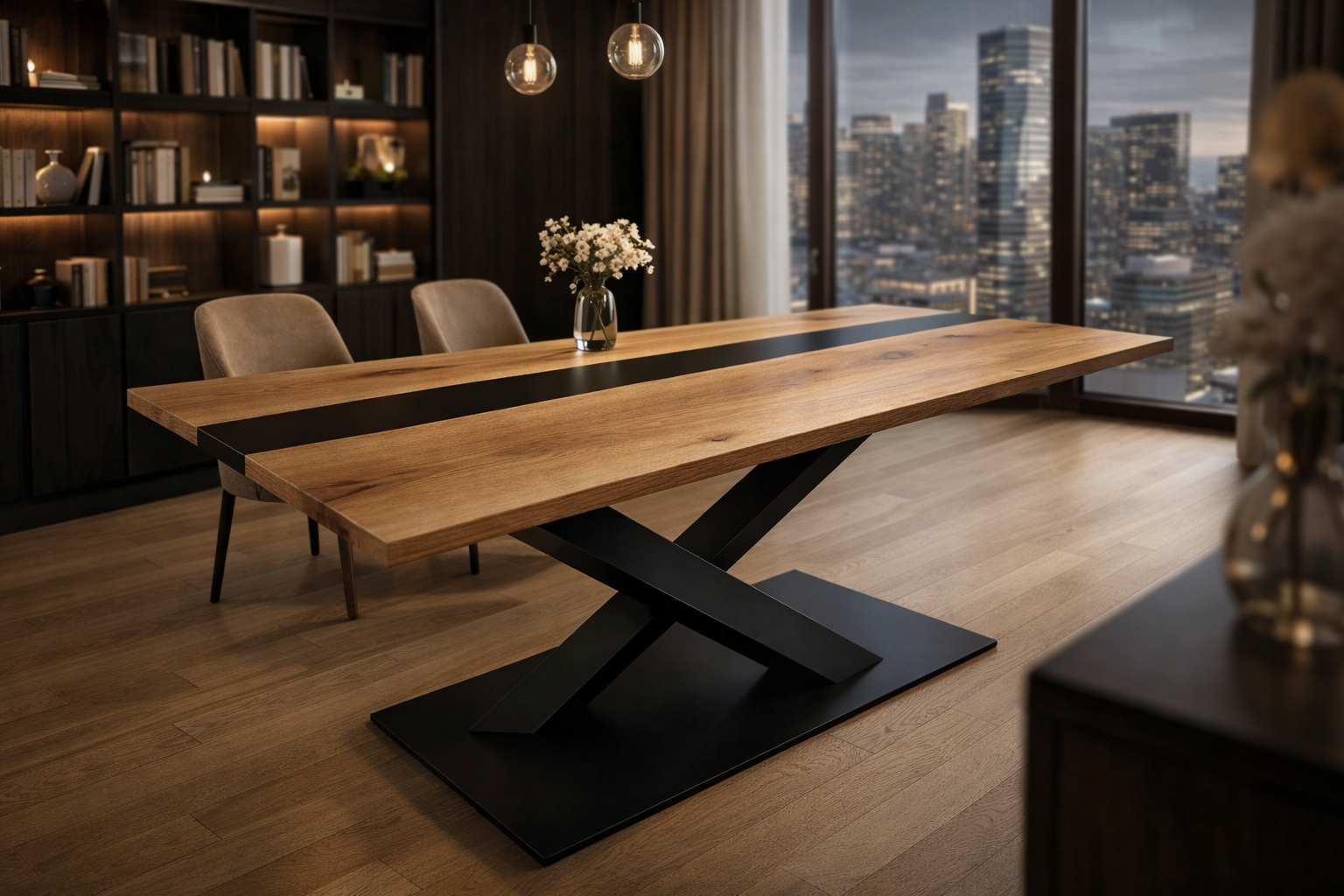 Ten stół to połączenie naturalnego piękna litego dębu z nowoczesną, industrialną formą. Masywny blat wykonany z wysokiej jakości drewna dębowego zachwyca wyrazistym usłojeniem, ciepłą kolorystyką i ponadczasowym charakterem. Każdy egzemplarz jest unikatowy – rysunek słojów i struktura drewna sprawiają, że stół staje się centralnym punktem wnętrza.