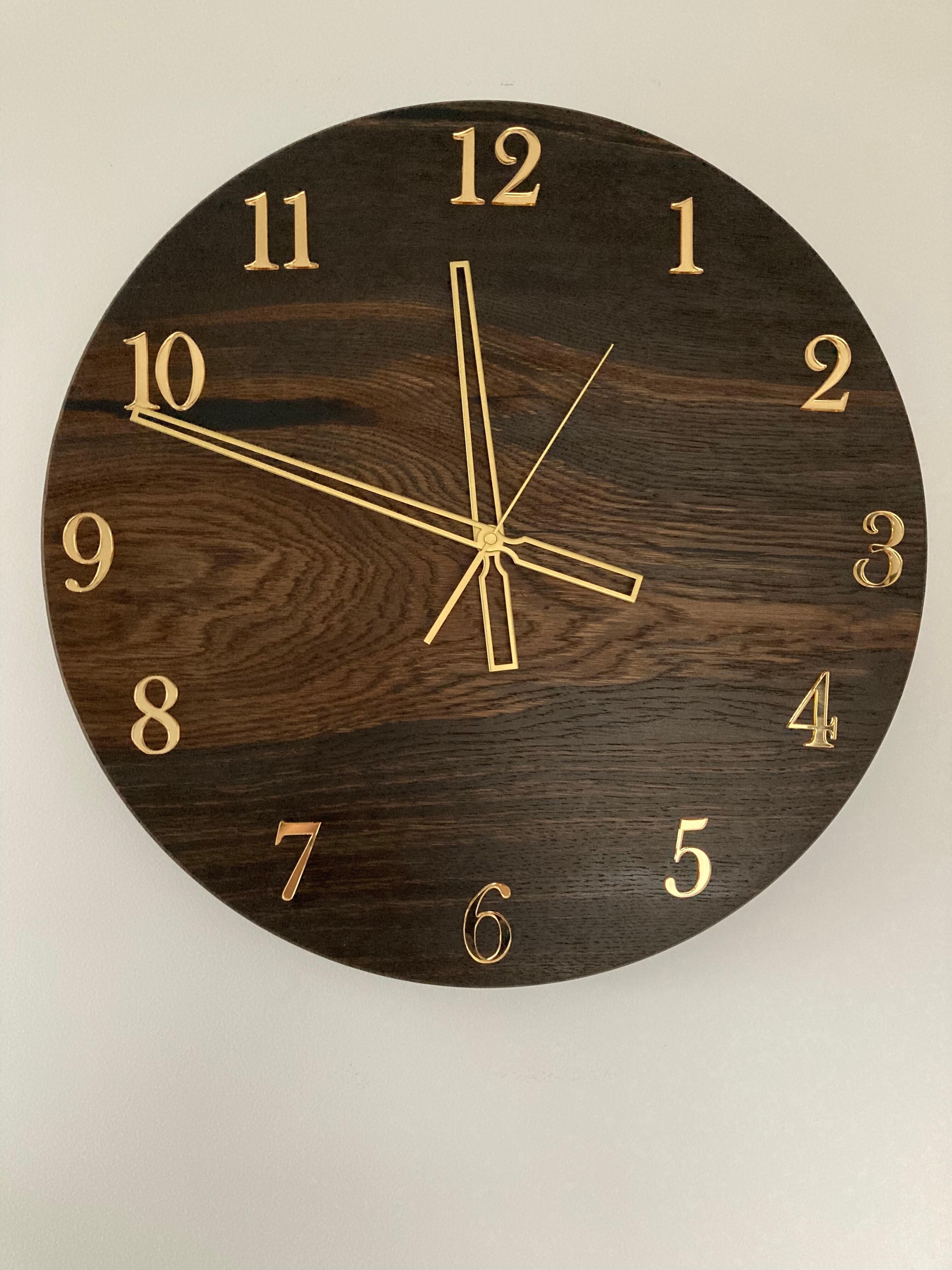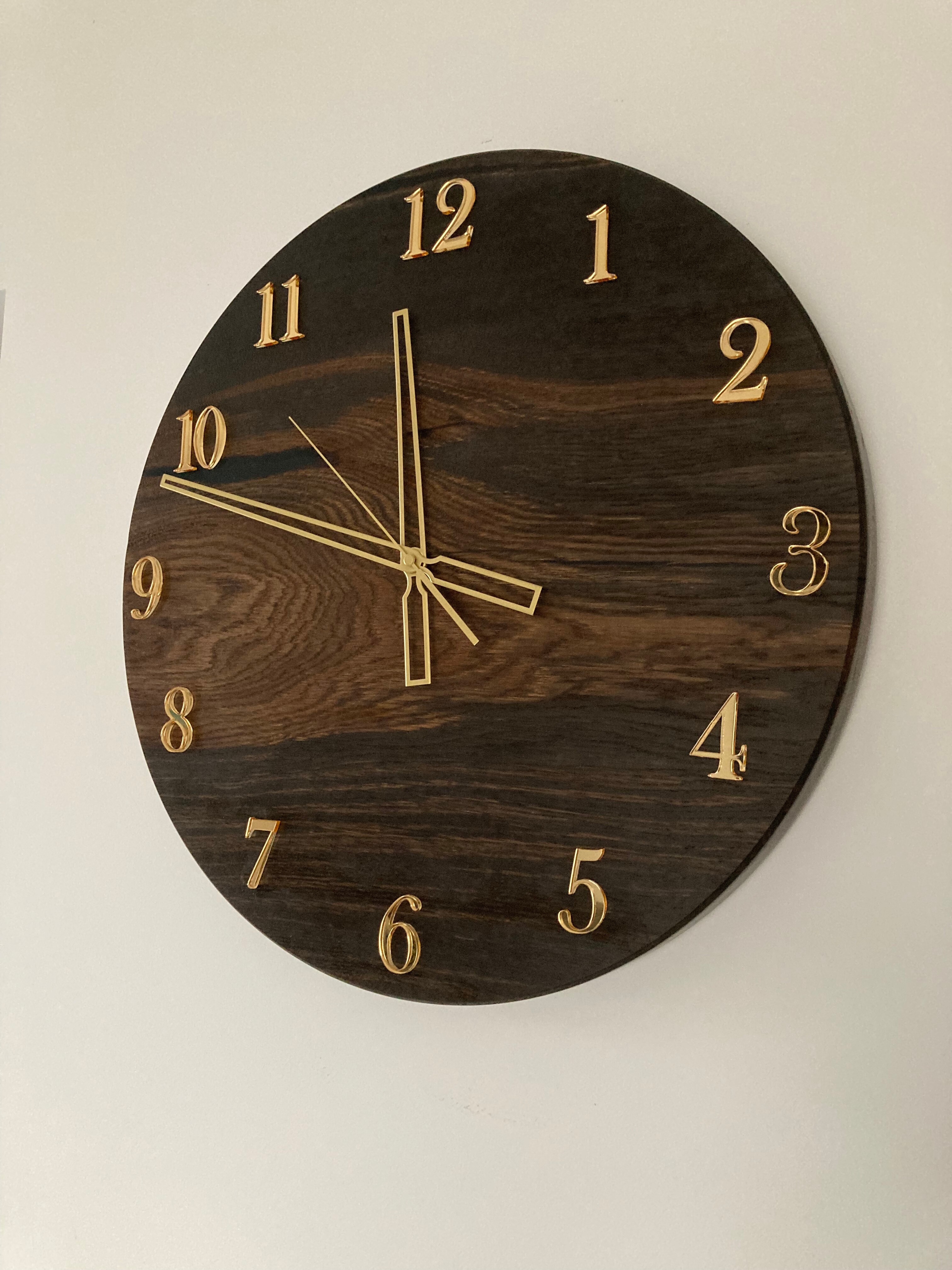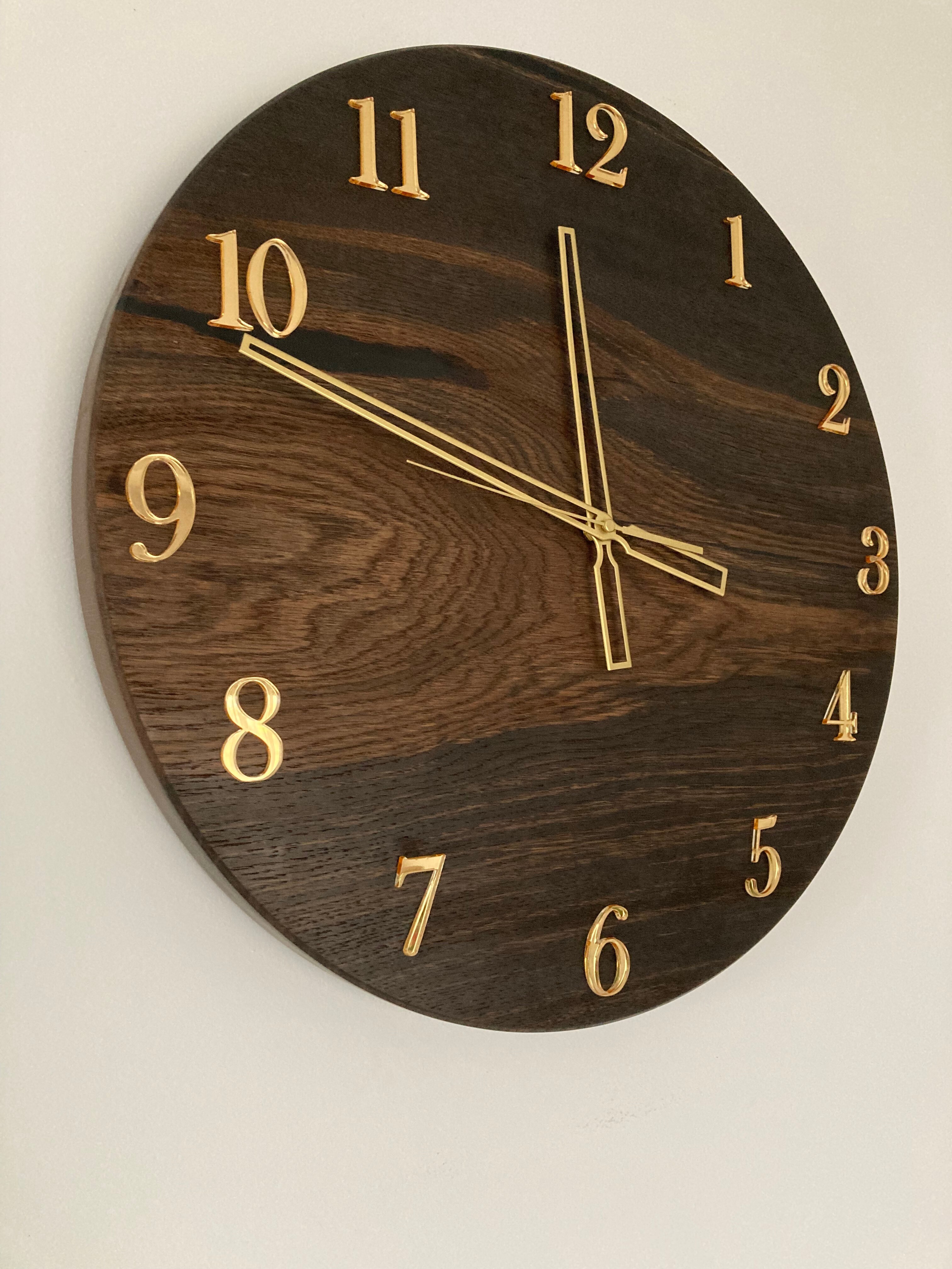 Złote cyfry i wskazówki wprowadzają subtelny kontrast, podkreślając elegancję i ponadczasowy charakter projektu. Ciepły blask złota harmonizuje z głęboką barwą drewna, tworząc spokojną, wyważoną kompozycję. Minimalistyczna forma pozwala wybrzmieć temu, co najważniejsze — materiałowi i idei.